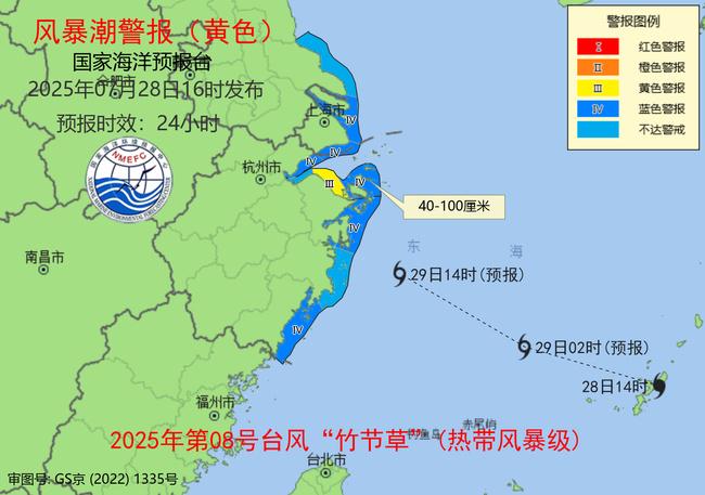 48小时预告:7月29日薄暮至30日下战书,江苏南通到浙江温州沿海将呈现40到100厘米的风暴增水。各涉海相关出产单元采纳积极无效的办法,请沿海及相关部分按照职责做好防御风暴潮的应急预备工做;72小时预告:7月30日薄暮至31日上午,