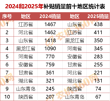 2025年,这十个地域,共补助公示发卖8100台,从截至2025年8月15日的补助公示数据来看,顺次是、江苏省、省、河南省、安徽省、、省、湖北省、陕西省和山东青岛,备注:1.2024年销量。