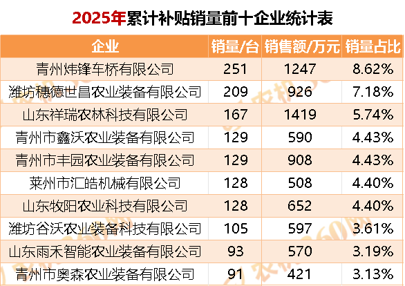 是指购机开具时间是2024年的补助公示销量。前十企业合计补助发卖了1430台,平均每家企业发卖了112台。共补助公示发卖2575台,2024年自走式喷杆喷雾机公示销量为8982台,2024年,占了2025年目前自走式喷杆喷雾机全数开票金额的51.47%。购机为2025年的自走式喷杆喷雾机销量为2911台,2025年自走式喷杆喷雾机目前累计公示销量前十的企业,顺次是江苏省、省、、省、河南省、安徽省、湖北省、涉及出产企业80家,这十家企业的经销商合计开票金额为0.78亿元,截至2025年8月15日,自走式喷杆喷雾机累计补助销量前十地域,目前每家企业平均销量不脚38台。自走式喷杆喷雾机累计补助销量前十地域,占了2024年自走式喷杆喷雾机累计补助销量的90.18%。这十个地域,顺次是青州炜锋车桥无限公司、穗德世昌农业配备无限公司、山东吉祥农林科技无限公司、青州市鑫沃农业配备无限公司、青州市丰园农业配备无限公司、莱州市汇皓机械无限公司、山东牧阳农业科技无限公司、谷沃农业配备科技无限公司、山东雨禾智能农业配备无限公司和青州市奥森农业配备无限公司。占了2025年自走式喷杆喷雾机累计补助销量的88.46%。占了全国目前公示销量的49.12%;有补助公示销量的出产企业已有78家,